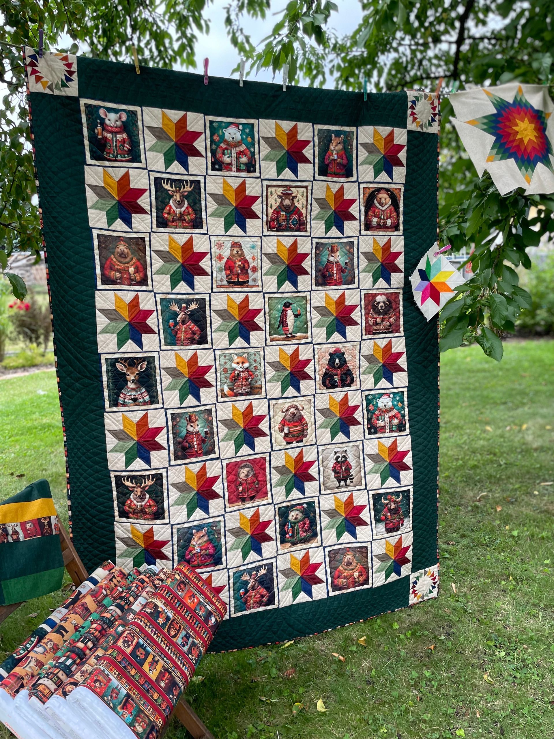 Hier tanzt der Pinguin im Weihnachtsmantel, der Eisbär trägt stolz seinen Ugly Christmas Sweater und sogar der Fuchs weiß, wie man sich in Schale wirft. Zwischen all den tierischen Unruhestiftern funkeln LeMoyne-Sterne im Farbverlauf. Ein tiefgrüner Rand hält das bunte Treiben zusammen. In den Ecken leuchten weitere Sterne. So entsteht ein Weihnachtsquilt voller Charme, Humor und festlicher Fröhlichkeit.